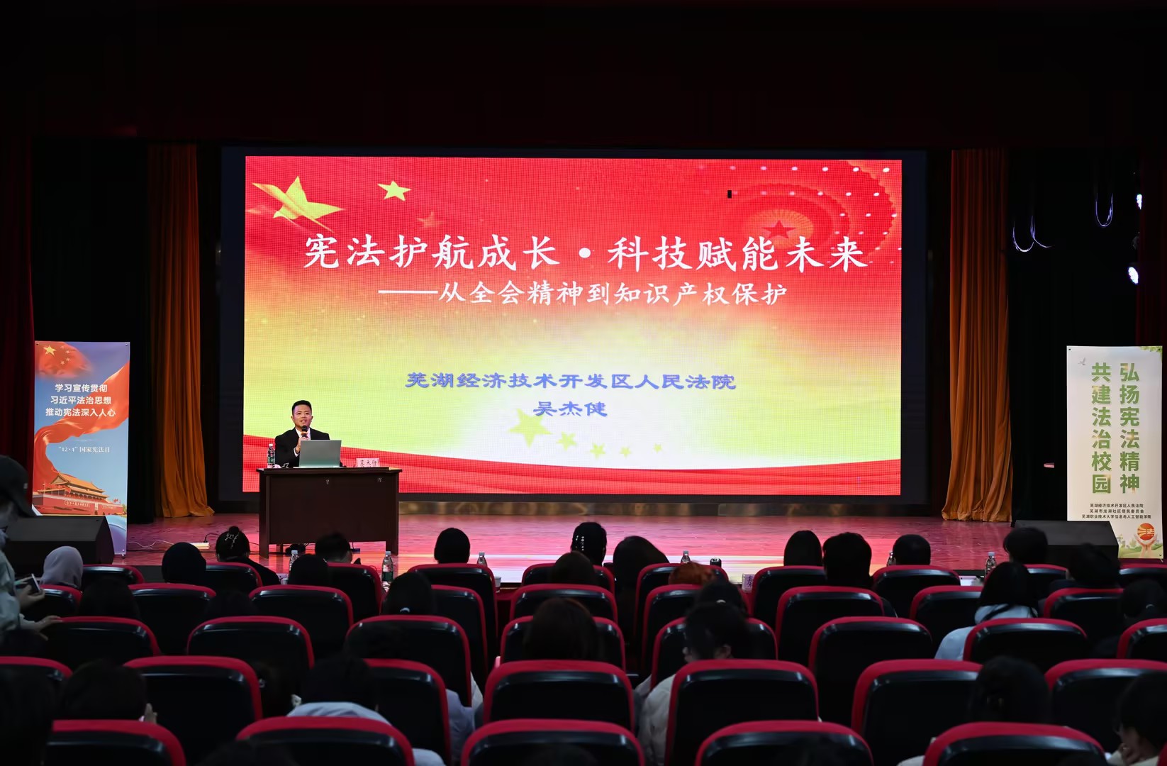 14时30分,宪法知识讲座在银湖校区大礼堂正式开讲。本次讲座由芜湖经济技术开发区人民法院三级法官吴杰健以“宪法护航成长·科技赋能未来”为主题主讲,吴杰健法学功底深厚,实践经验丰富,曾借调至最高人民法院第四巡回法庭协助办案,其办理的多起案件入选省级参考案例及十大知识产权案件,撰写的论文亦多次获奖并发表于权威刊物。他用通俗话语深入解读宪法核心精神、核心条款及党的二十届四中全会精神,既立足宪法作为国家根本大法的地位,阐释其对公民权利的根本保障,又紧扣科技信息、人工智能的专业特色,从“宪法赋能科技”切入,结合AI文生图等典型案例,生动阐释司法对新类型创新权益、知识产权的保护路径,让宪法精神与专业实践深度融合,让在场听众对宪法精神有了更为深刻的理解。