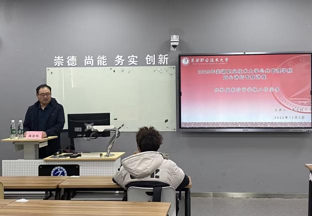 近日,公共管理学院特邀芜湖市纪委监委信访室主任潘法柱和芜湖市教育局党委委员、市纪委监委驻市教育局纪检监察组组长赵向荣来校开展纪检监察领域专题讲座。公共管理学院专业教师代表及党务工作专业(纪检监察方向)全体学生到场聆听学习。