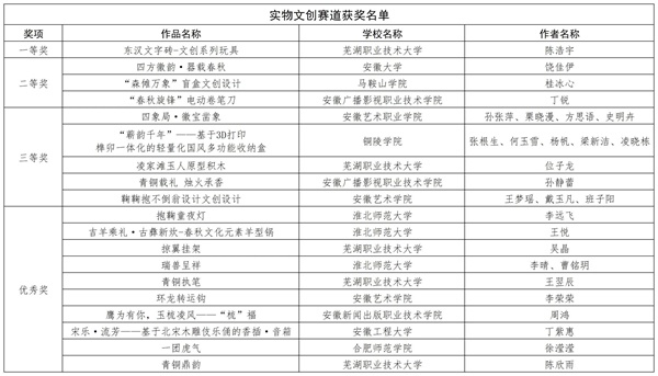 日前,安徽省大学生博物馆文创设计大赛公布获奖名单。我校艺术传媒学院学生在大赛实物文创赛道荣获一等奖1项、三等奖1项和优秀奖3项,是该赛道获奖质量和数量最佳的高校。