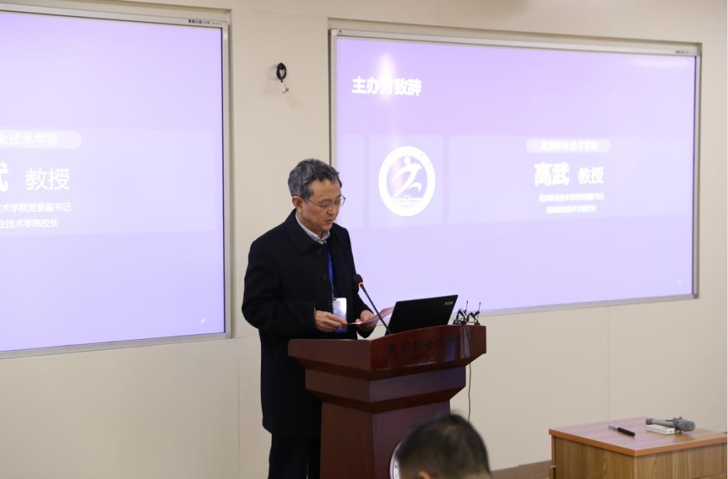 校党委副书记、校长高武代表主办方致辞,向莅临我校参加会议的领导、来宾表示热烈的欢迎。他指出,自“双高计划”立项建设以来,作为安徽高职教育发展的“排头兵”,芜湖职业技术学院及省内各“双高计划”建设单位,坚持以党的建设为统领,落实立德树人根本任务,以提质培优、增值赋能为主线,主动适应区域经济社会发展和产业升级的新要求,聚焦关键领域改革,努力提高人才培养质量和社会服务能力,着力打造安徽职业教育发展的新名片。高武提出举办安徽省“双高计划”专业群建设研讨会,旨在加强“双高计划”建设单位之间的交流研讨和相互学习,分享各院校在“双高计划”建设中的成功经验。希望今后能将“双高计划”建设研讨活动常态化、研讨主题系列化,吸纳更多的省内高职院校参与其中,并借此平台进一步拓展兄弟院校之间交流合作领域,不断寻求安徽高职教育发展的新亮点和新突破,发挥“双高计划”建设的示范引领效应,带动全省职业教育内涵发展水平的整体提升。