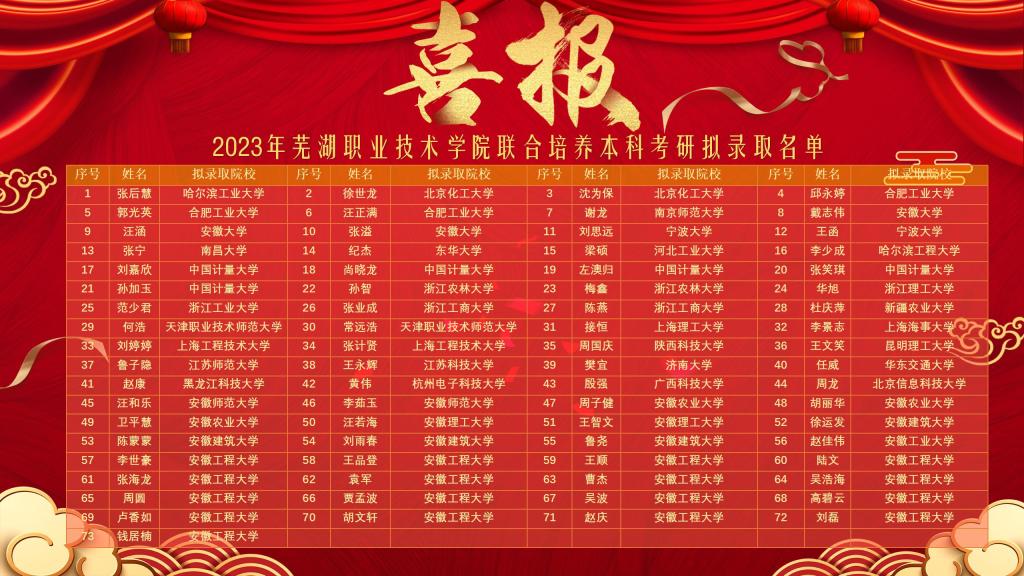 心田耕耘矢志坚,榴花欲燃捷报传。随着2023年全国硕士研究生招生录取结果陆续公布,我校与安徽工程大学联合培养2023届考研学子喜讯频传。截止4月26日,共有73名学生录取哈尔滨工业大学、北京化工大学、南京师范大学、安徽大学、合肥工业大学等国内外知名高校,其中16人被“985”“211”“双一流”高校录取!这份漂亮的考研成绩单既是考研学子努力拼搏、发奋苦读的成果,也是我校落实“立德树人”根本任务,不断提高教育教学质量,注重内涵建设的重要体现。