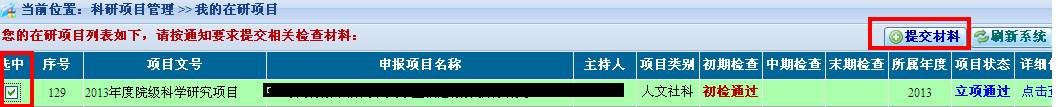 第二步:选中个人要检查的项目,然后点击右上角的“提交材料”按钮。