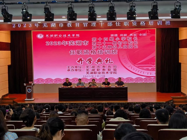 为加强教育管理干部队伍建设,落实校长(园长)持证上岗制度,7月7日下午,由芜湖市教育局主办,芜湖职教联盟、芜湖职业技术学院承办的2023年芜湖市第二十一期初中校长任职资格培训班、第十四期小学校长任职资格培训班和第十五期幼儿园园长任职资格培训班在我校南校区图书馆报告厅隆重举行。芜湖职业技术学院副校长刘育红、市教育局组干科科长余源、继续教育学院副院长李玉胜、社会培训中心主任郎均宁出席典礼,典礼由继续教育学院党总支书记赵敬德主持。