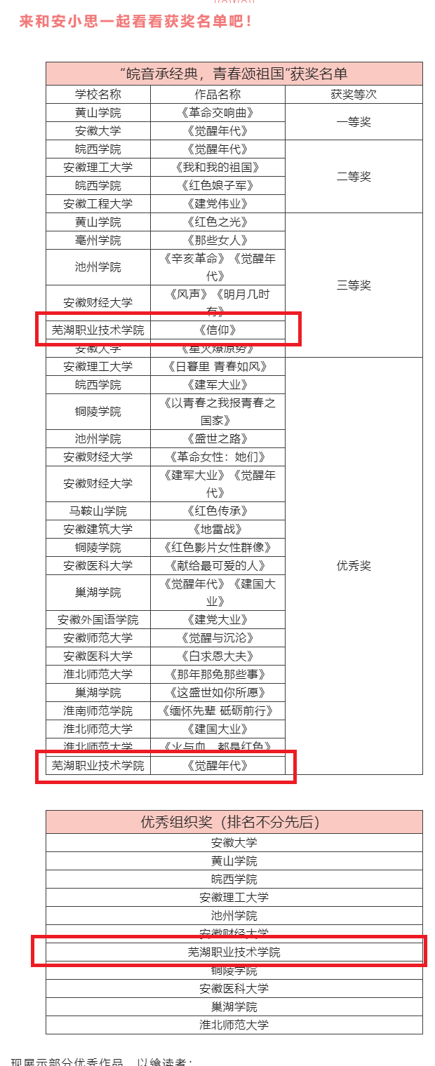 近期,安徽省高校网络思想政治工作中心组织开展“皖音承经典,青春颂祖国”红色经典影片配音作品征集活动,共21所高校参与活动,58部作品参与专家评审。我校学生处易班发展中心精心谋划,组织各学院拍摄制作红色经典影片配音视频作品,荣获优秀组织奖。同时,由信息与人工智能学院报送的《信仰》和园林园艺学院报送的《觉醒年代》分别获三等奖和优秀奖。