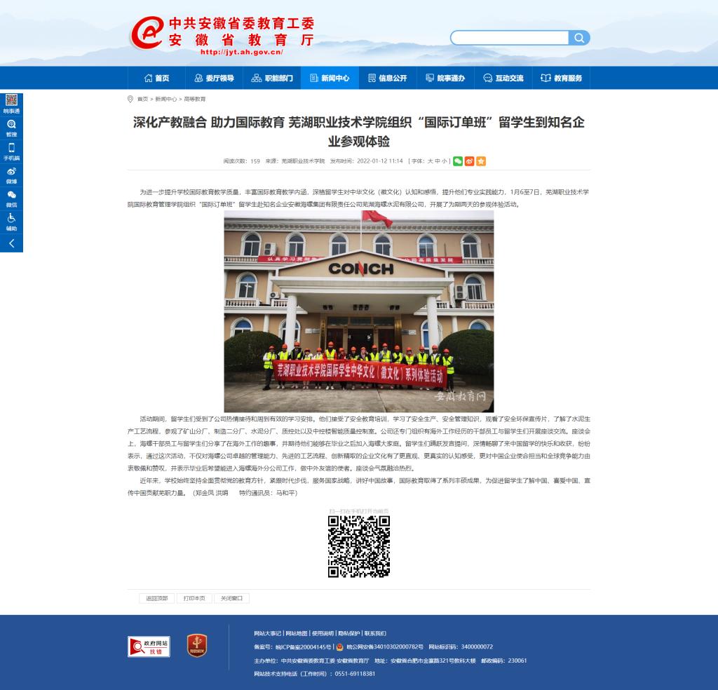 为进一步提升学校国际教育教学质量,丰富国际教育教学内涵,深植留学生对中华文化(徽文化)认知和感悟,提升他们专业实践能力,1月6至7日,芜湖职业技术学院国际教育管理学院组织“国际订单班”留学生赴知名企业安徽海螺集团有限责任公司芜湖海螺水泥有限公司,开展了为期两天的参观体验活动。
