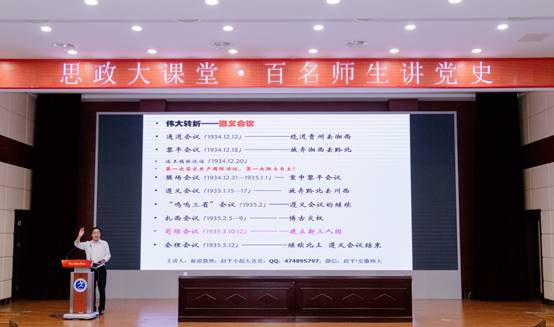 赵平教授做“聆听中共百年历史的足音——品味遵义会议精神”的专题宣讲。他通过“四问”给大家讲述了遵义会议的历史意义、遵义会议精神的内涵和铸就过程以及遵义会议精神的昭示,帮助同学们更好的理解在全面建设社会主义现代化强国的过程中必须坚持实事求是、坚守创新思维、坚定理想信念、完善民主集中制、坚持独立自主。在提到理想信念时,他特别强调,作为青年大学生要深刻认识到坚定“四个自信”尤其是文化自信的重要意义,发扬红色传统,赓续共产党人的精神血脉。