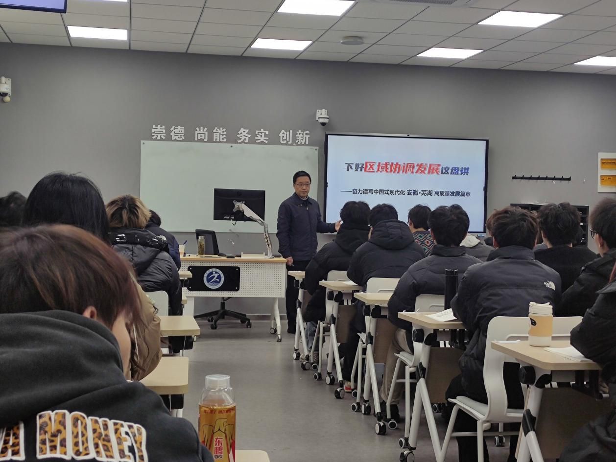 王志鹏所授专题为《下好区域协调发展这盘棋——奋力谱写中国式现代化“安徽·芜湖”高质量发展篇章》,他从著名的“胡焕庸线”导入,围绕“全国一盘棋,协调重全局”“洞悉大棋局,把握新形势”“落子循章法,瞄准高质量”等三个部分,深入浅出地讲授了中国经济的宏观形势,区域经济协调发展的主流趋势,以及新发展理念下安徽和芜湖如何加速融入长三角一体化发展新格局等内容。课间,他还与同学们亲切交流,勉励大家毕业后留芜发展,与紫云英共同绽放靓丽青春。