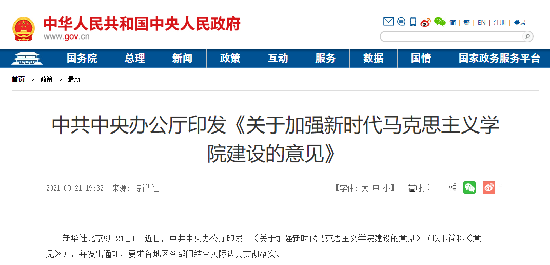 新华社北京9月21日电 近日,中共中央办公厅印发了《关于加强新时代马克思主义学院建设的意见》(以下简称《意见》),并发出通知,要求各地区各部门结合实际认真贯彻落实。