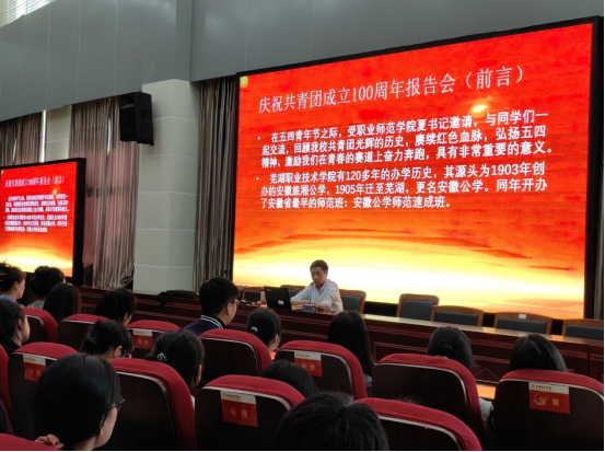 金根木是芜湖旗帜报告团成员。他结合对芜职院红色校史的挖掘和研究,讲述芜职院的发展历史,尤其在革命时期所涌现的革命烈士和历史名人作了较为详细的介绍。最后,他勉励大家传承学校红色基因,赓续红色校史血脉,弘扬“五四”精神,奉献青春力量。同学们认真聆听,感触颇深。