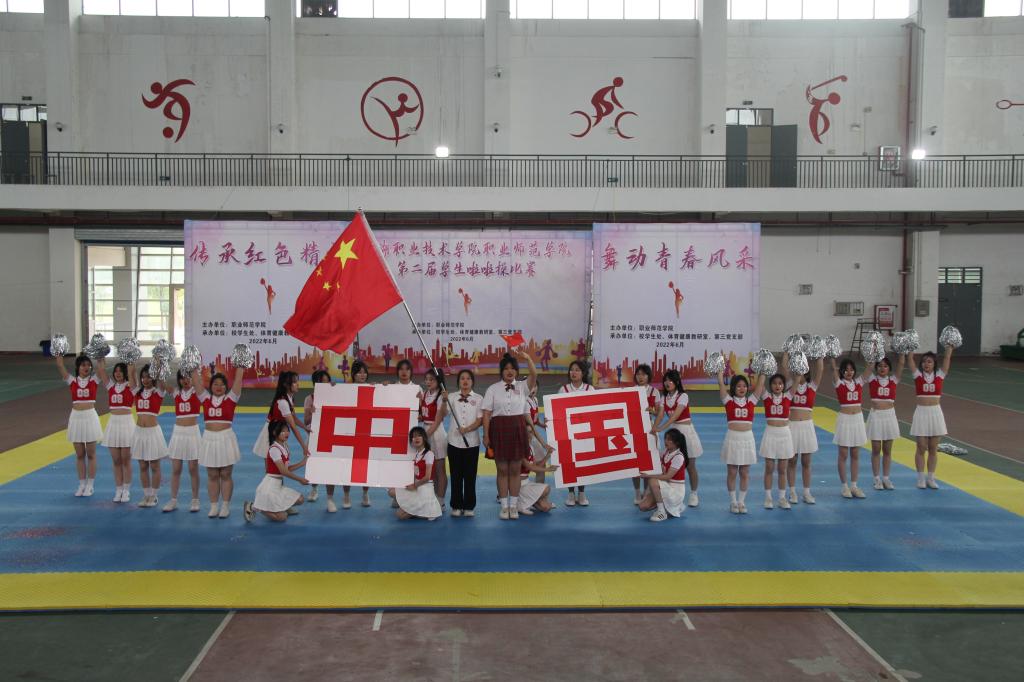 6月2日,职业技术师范学院“传承红色精神·舞动青春风采”首届啦啦操大赛在白马校区举行。本届比赛由职业师范学院主办,原师范学校学生处、体育健康教研室、第三党支部承办。开幕式由职业师范学院筹备组成员张学平主持,筹备组行政负责人邬余俊致词,筹备组党委负责人夏效祥宣布比赛正式开始。因疫情防控需要,本次比赛采用直播的形式,全体师生通过班班通或手机在线观看。