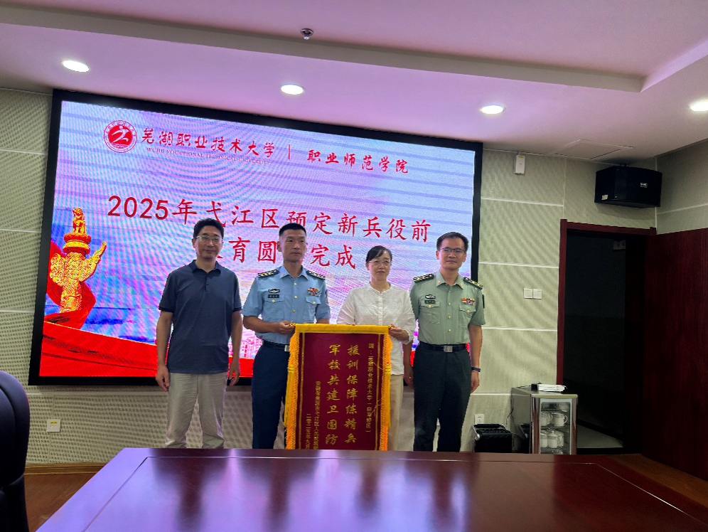 9月29日上午,弋江区人民武装部部长汤颜蔚、副部长王玉华等一行3人专程来到芜湖职业技术大学(白马校区),将一面印有“援训保障练精兵,军校共建卫国防”的锦旗送到职师院院长娄洁手中,代表弋江区人民武装部对学校(白马校区)积极提供役前训练场地、支持国防建设的举措表示诚挚感谢。职师院领导参加赠旗仪式。