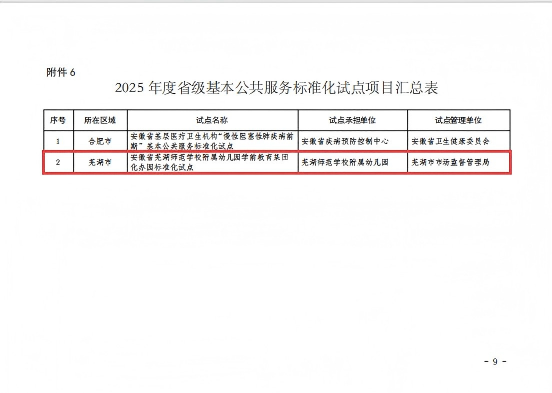 近日,安徽省市场监督管理局印发《2025年省级标准化试点项目的通知》,芜职大芜师幼教集团申报的“学前教育集团化办园标准化试点”成功入选,本年度省级基本公共服务标准化试点项目仅批准两项。